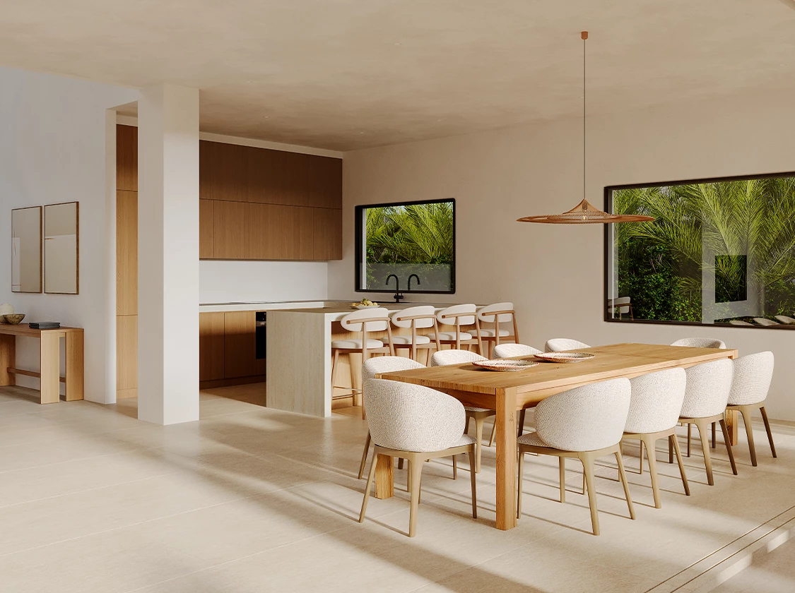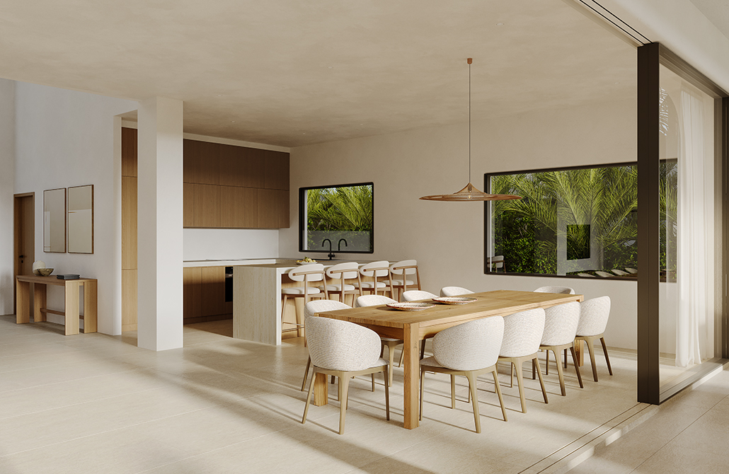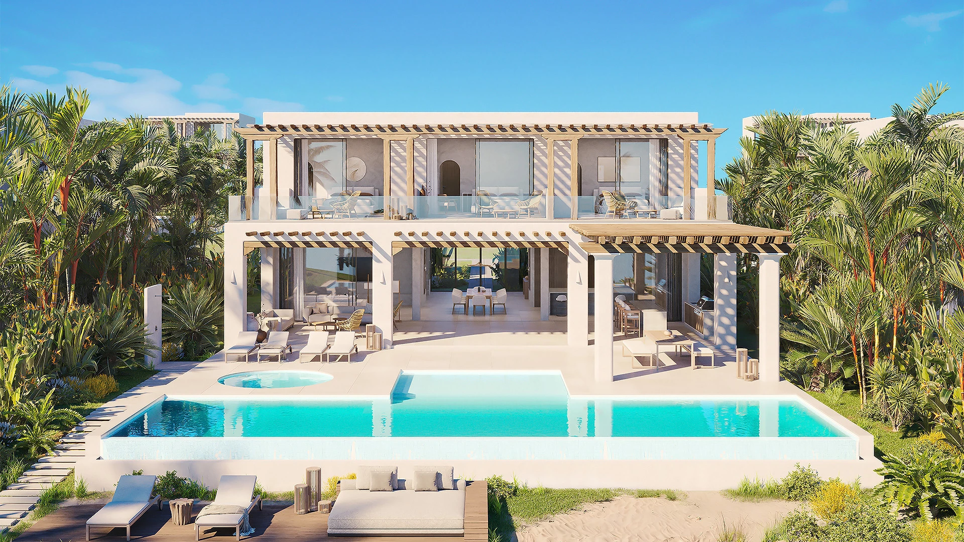 Set directly along Anguilla’s shoreline, the two-story Beach Villa showcases effortless grandeur with five to seven bedrooms and the option to add cottages or a garage. A dramatic double-height entry leads to a 51-foot pool and over 70 feet of ocean frontage with shaded and sunlit lounging. With up to 10,250 square feet of total space, including two primary suites facing the sea, the Beach Villa epitomizes modern coastal luxury.