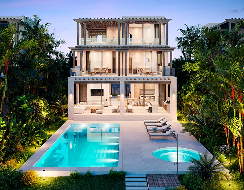 Elevated across three floors, the Anguilla House blends versatility and elegance with four to seven bedrooms and flexible configurations for rooftop or cottage additions. Homeowners may choose a dedicated rooftop suite or lounge overlooking the water. Measuring up to 7,697 square feet, the residence’s open design, 36-foot pool, and easy access to the Beach Club create a tranquil, contemporary retreat where ocean views define each day.