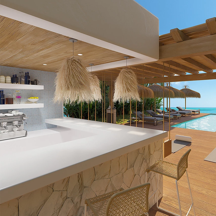 The four 5-to-6 bedroom beachfront Design One villas enjoy over 75’ of beach frontage, and spanning up to 8,500 sq. ft. of impeccably finished indoor and outdoor area.