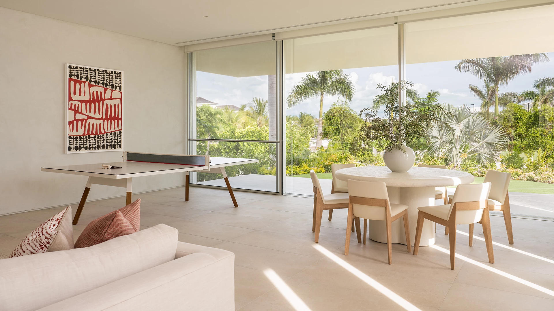 The expansive ground floor of villa 2 features an open plan living and dining room and a chef’s kitchen, complete with state-of-the-art appliances and a huge island, perfect for large family gatherings overlooking the great room. High ceilings with slim-framed, floor to ceiling glass offers outstanding views of Grace Bay beach. One king-bedded bedroom with garden view and ensuite bathroom, media room with ping-pong table and card table, powder room, laundry room and office are also located on the ground floor.