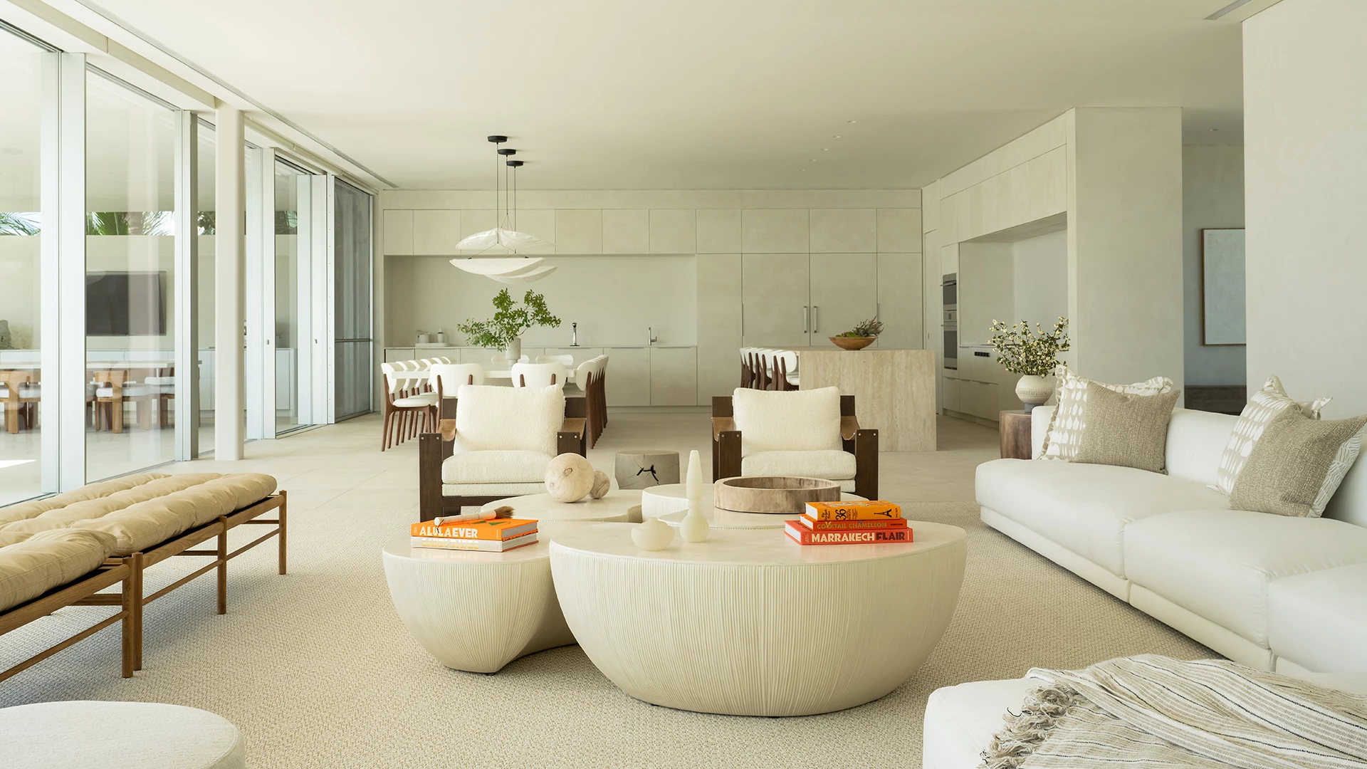 Outdoors, features a covered terrace, outdoor kitchen, dining table, plush lounge seating, a 52’ infinity-edge pool, jacuzzi and sundeck perfect for year-round indoor/outdoor living and the best sunsets on the island.